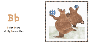 Animal ABC is a Scots alphabet book which introduces bairns to simple Scots words through alliterative phrases, including birlin bears wi big bahoochies, drookit draigon in a dub, and feart flamingoes in a fankle.